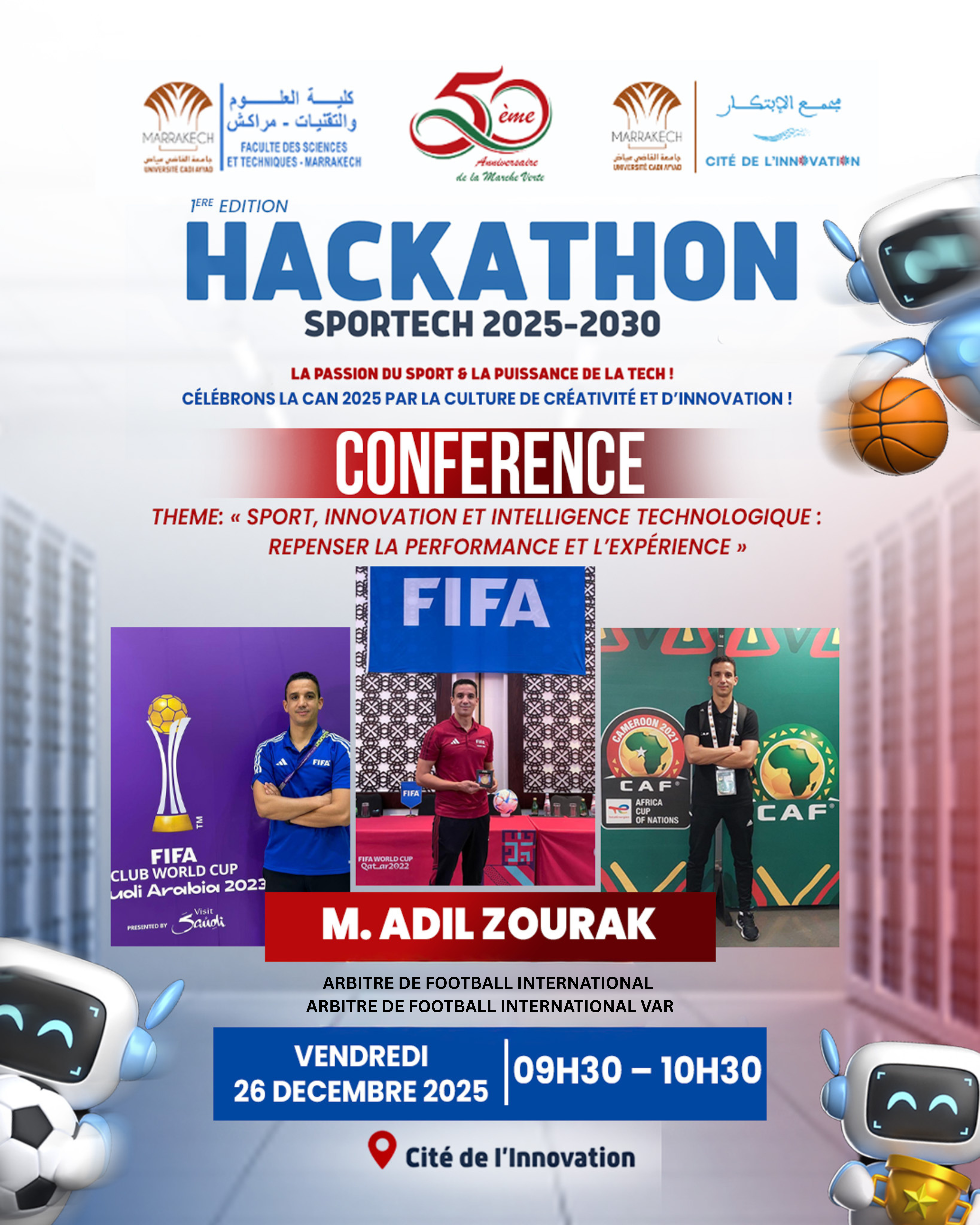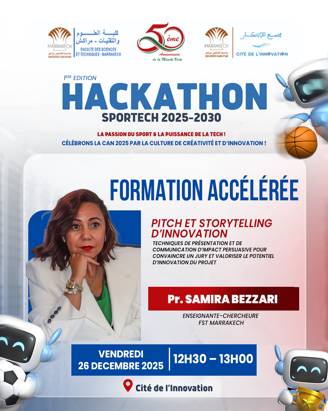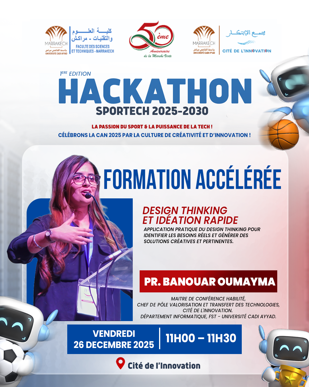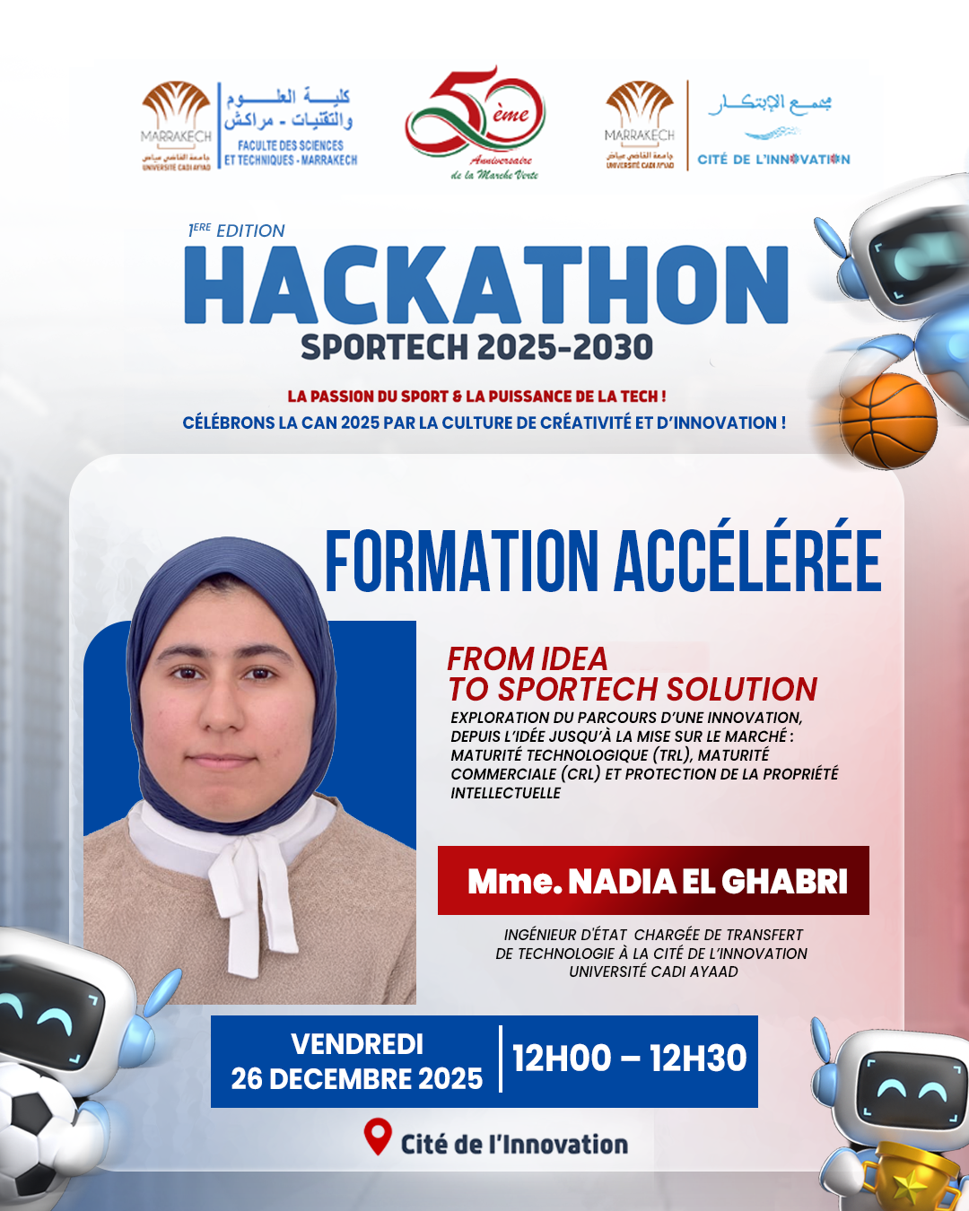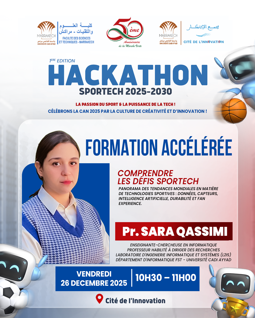la Cité de l’Innovation et la Faculté des Sciences et Techniques de Marrakech co-organisent la 1ère Edition du Hackathon SportTech 2025-2030 sous le thème : « La passion du sport & la puissance de la tech ! », qui se tiendra les 26 et 27 décembre 2025 à la Cité de l’Innovation.